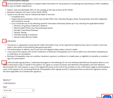 7) After your ID is uploaded, click the Upload button. The next screen is the HIPAA Authorization Release page. Please read everything carefully, check the boxes, add your signature, and click ‘Next’: