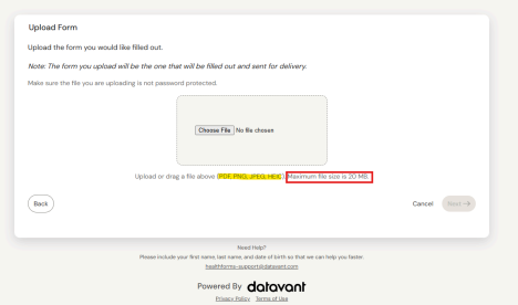 *Please note, the only formats we accept are PDF, PNG, JPEG, and HEIC, All forms must be combined into a single file, and they cannot exceed 20 MB.