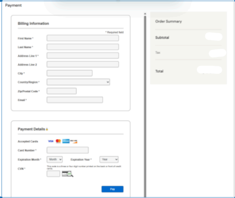 8) After clicking ‘Submit’ on the confirmation screen, you will be taken to the payment screen. Please enter your payment information and click ‘Pay’: